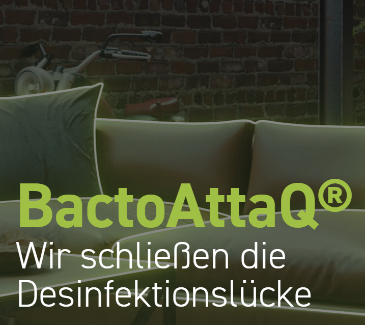 BactoAttaQ® ist ein selbstdesinfizierender Oberflächenschutz für Textilien und feste Oberflächen. Einmal fachgerecht aufgetragen bietet BactoAttaQ® mind. 365 Tage Desinfektionsschutz und reduziert 99,999% der Bakterien und speziellen Viren.