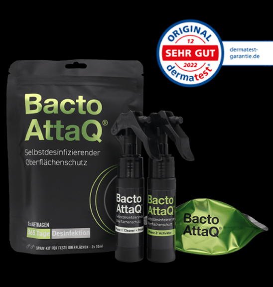 BactoAttaQ® ist ein selbstdesinfizierender Oberflächenschutz für Textilien und feste Oberflächen im Innen- und Außenbereich. Einmal fachgerecht aufgetragen bietet BactoAttaQ® 365 Tage Desinfektionsschutz und reduziert bis zu 99,999 % der Bakterien und speziellen Viren. Darüber hinaus wirkt BactoAttaQ® schimmelhemmend und geruchsneutralisierend: Dank BactoAttaQ® wird die Schimmelneubildung konstant unterbunden und bakteriell bedingte Gerüche werden reduziert. Dermatologisch getestet und für "sehr gut" befunden.